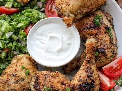 Served with some fried cabbage, mushrooms, and red onions, a side of green salad, and half an avocado. Smaller leg quarters can be done in about 1.5 hours, while larger ones can take 2 hours or more. Remove the chicken when the internal temperature reaches 165 degrees. Keep an eye on your cooking temperature and hold it at 275 degrees. Finish over direct heat for about 10 minutes, 5 minutes per side.